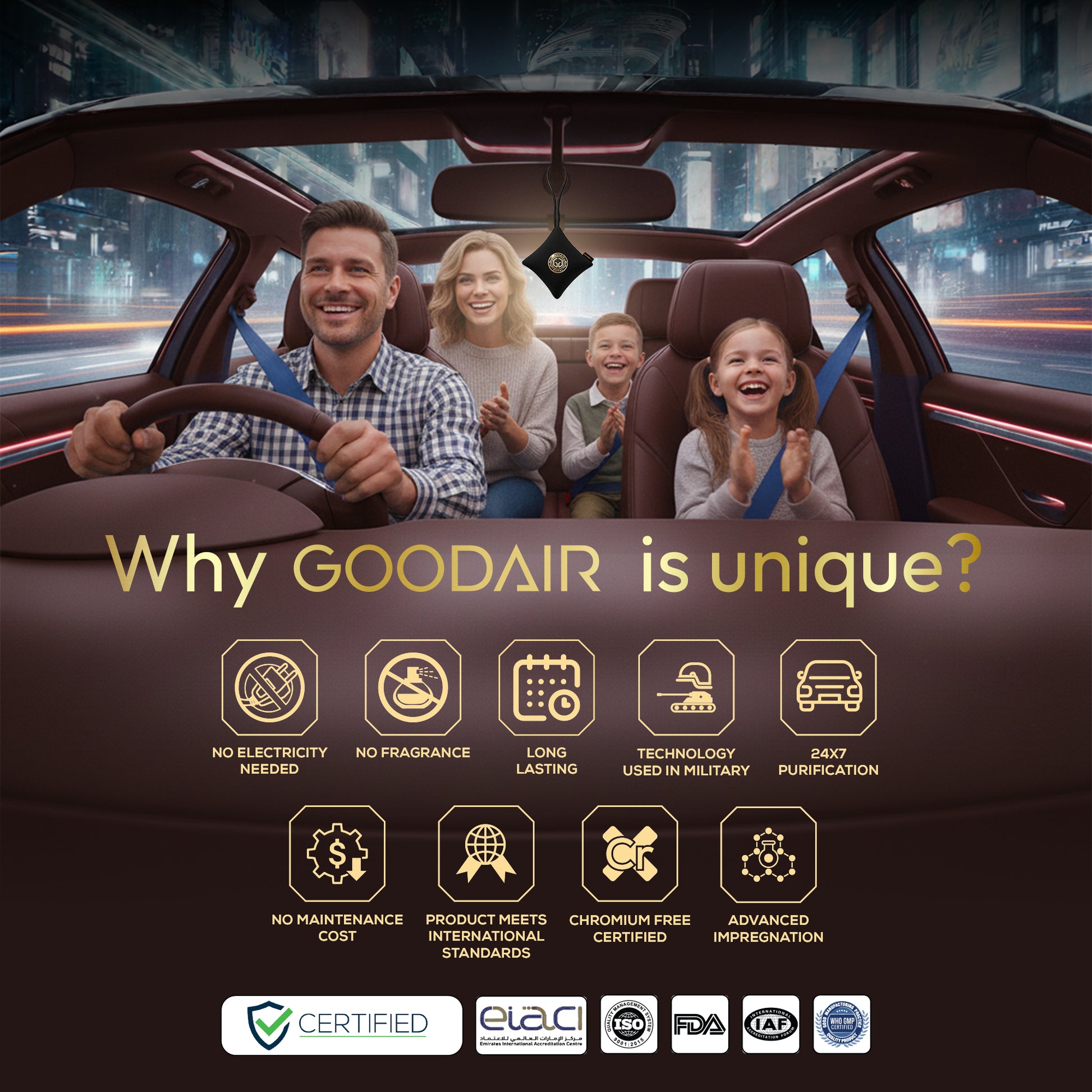 GOODAIR outshines in-built air purifiers with its non-electric, defence-grade, advanced impregnated carbon technology. The activated carbon in GOODAIR is rigorously tested and certified for its ability to adsorb toxic gases, ensuring optimal performance. Unlike in-built purifiers that suffer from high maintenance costs, frequent filter replacements, and limited efficacy when the car engine is off, GOODAIR ensures constant 24x7 purification. It requires only a monthly recharge in direct sunlight and boasts a lifespan of up to 1.5 years. Its autonomous operation guarantees a cleaner and toxin-free environment in the car, making it a superior choice for cleaner and safer air.